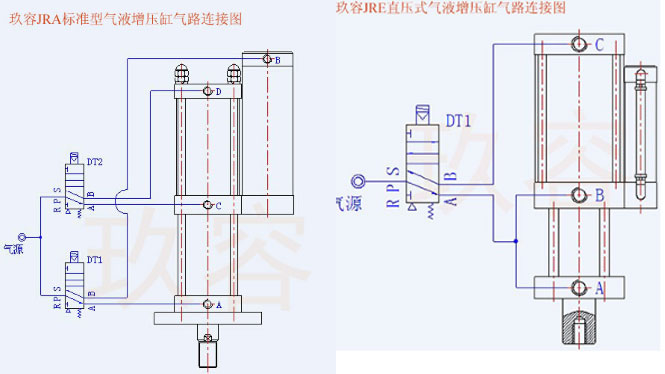 大家都知道氣液增壓缸是氣驅液壓元件,只需輸入氣體即可完成工作,而氣液增壓缸有多個進氣口,比如:JRA預壓式氣液增壓缸4個進氣口,B預壓下降氣口、D增壓下降氣口、A預壓回位氣口、D增壓回位氣口;JRE直壓式氣液增壓缸3個進氣口,C增壓下降氣口、A增壓回位氣口、B增壓回位氣口。